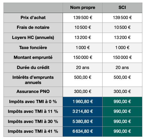 Lorsque l'on investi en nom propre notre fiscalité personnelle se mélange avec la fiscalité de nos revenus locatifs. Plus on progresse, plus notre base imposable augmente mais surtout plus notre taux d'imposition augmente.