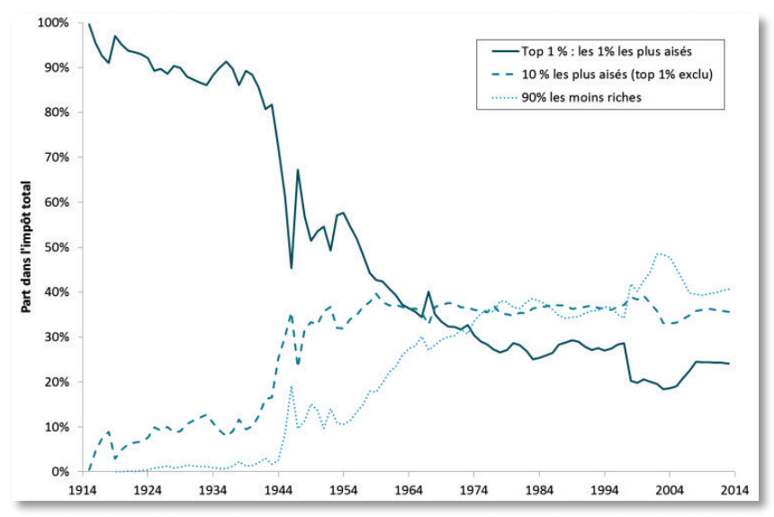 35 % par les 10 % les plus riches (hors top 1 %) ;25 % par les 1 % les plus riches.Mais ce dernier chiffre a beaucoup baissé sur les 100 dernières années contrairement au reste de la population.